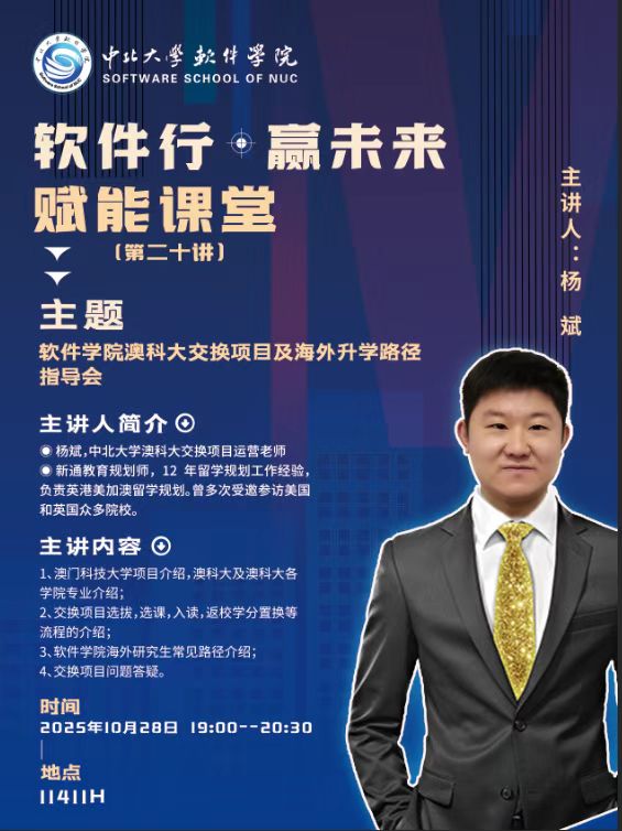 依托“软件行·赢未来”赋能课堂品牌,于10月28日晚在11411H教室成功举办了澳门科技大学交换项目宣讲暨海外升学路径指导会,吸引了黄色电影百余名有国际发展意向的学生踊跃参与。