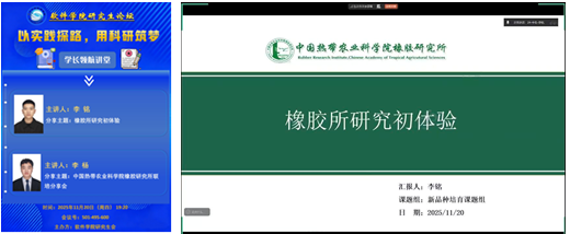 李铭同学从橡胶所的发展历程切入,阐述了天然橡胶作为国家战略资源的重要价值,并且结合自身的点云研究方向,分享了在橡胶树品种培育中的数据采集等科研经历。李杨同学则聚焦“智赋橡胶”的跨界探索,介绍了其搭建蜂鸟物联网平台的技术实践,还分享了从测产取样等田间一线工作到台风灾情调研的亲身经历,最后还分享了他们的联培美好生活。讲解结束后,大家围绕科研、生活等问题积极交流,李铭、李杨两位同学结合自身经历逐一耐心解答,进一步扫清了同学们对该联培的认知疑惑。
